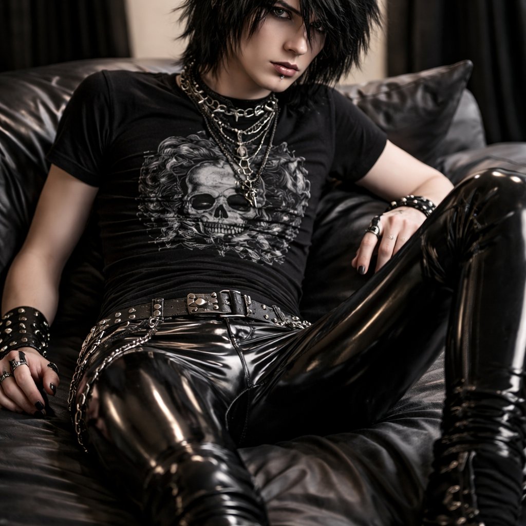 Cute Feminine emo boy in tight latex pants laying on his side smirking