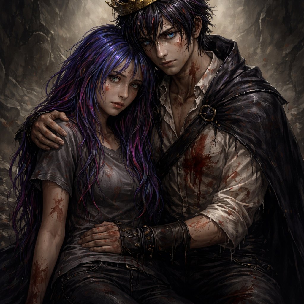 A 17 year old girl who has blue hair with purple and pink stripes and has hazel eyes. She is wearing a gray shirt and black pants. She looks tried. Next to her is an 18 year old prince who has black hair with purple stripes and blue eyes. He is wearing a bloody white shirt and black pants. He is wearing a golden crown. He also looks tired. He has is hands wrapped around the girl. Even though they both look tired they still look determined.