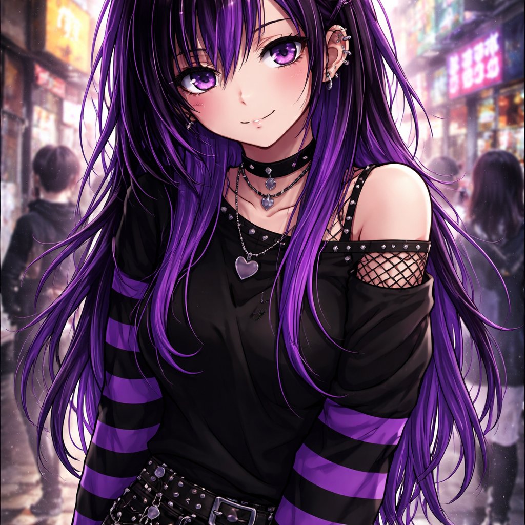 Emo with purple color and black and she is just looking different from others but happy and tired