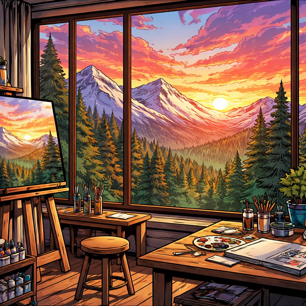 Realistic, refined, no caricature a large window in an artist, studio, overlooks, forests, and mountains with snow capped peaks. It is sunset.