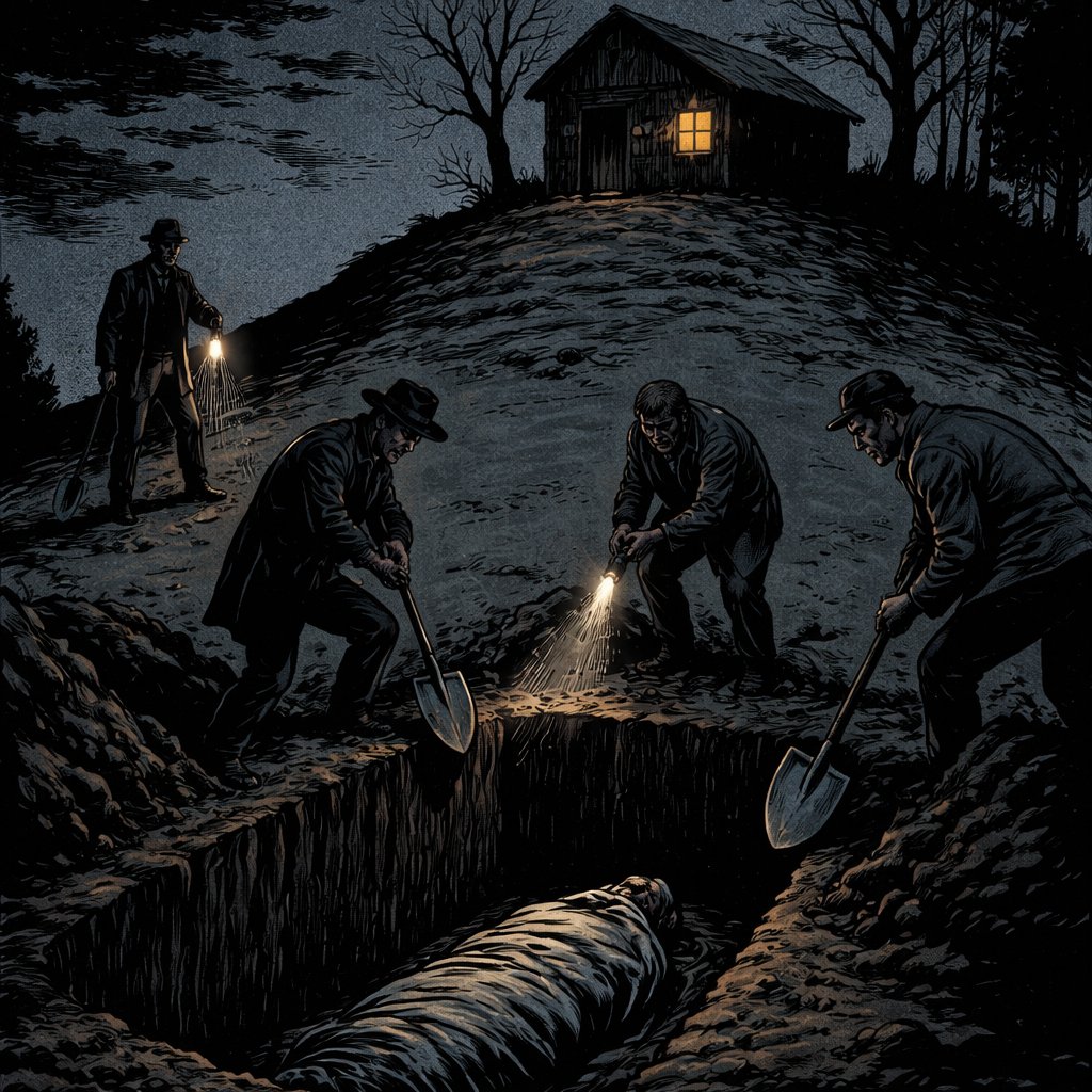 No caricature no speech bubbles a dark burial at night on the hill near the top of the hill is a little shack with a light. Everything else is dark. It is late evening with a slightly menacing feel.