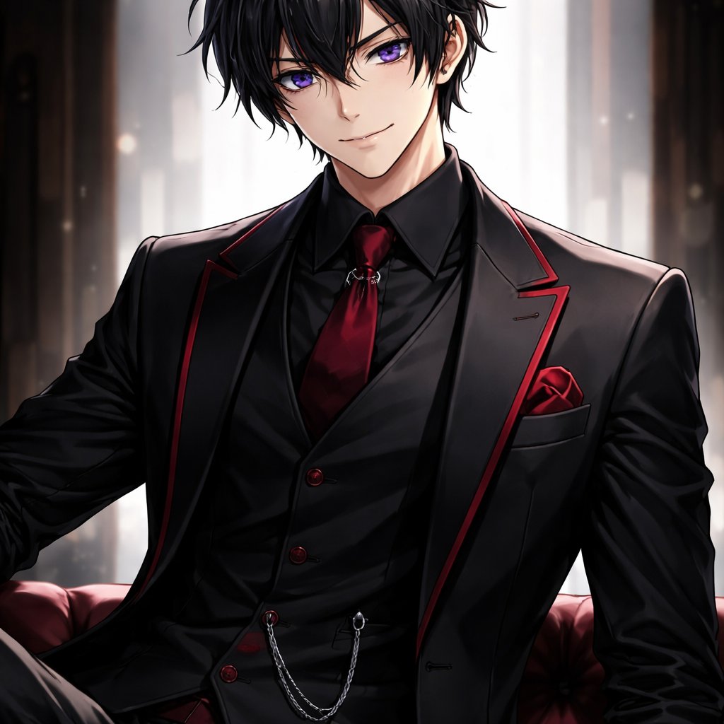 Young man with black hair and purple eyes in a black and red three piece suit