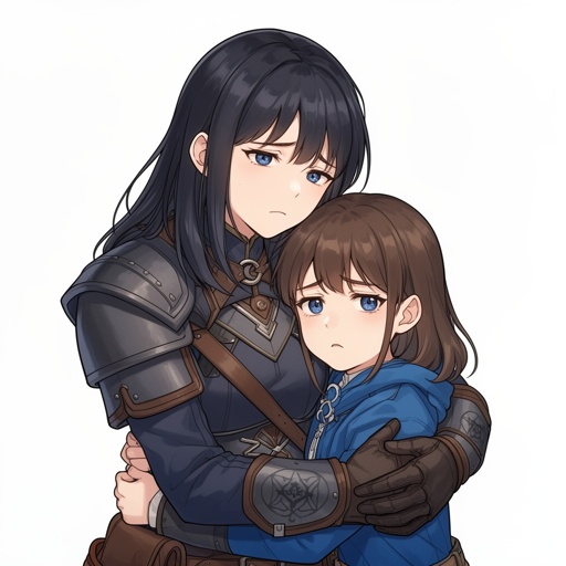 woman and her 9 year old daughter, looking sad, not crying, D&D, in the style of a manwa full color, No background, hugg...