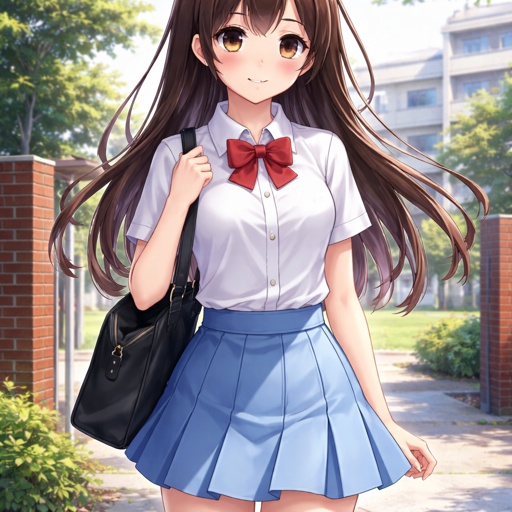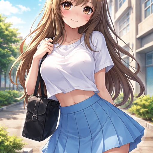 Anime girl at school in a white shirt and sky blue mini skirt.