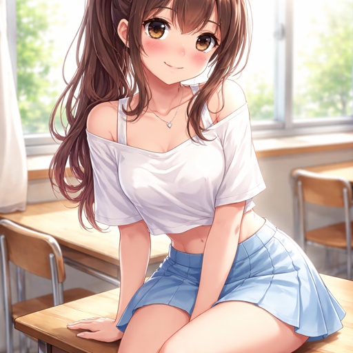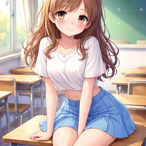 Hot, cute Anime girl at the school in a white loose crop top and sky blue mini mini skirt. She is sitting on the desk. S...