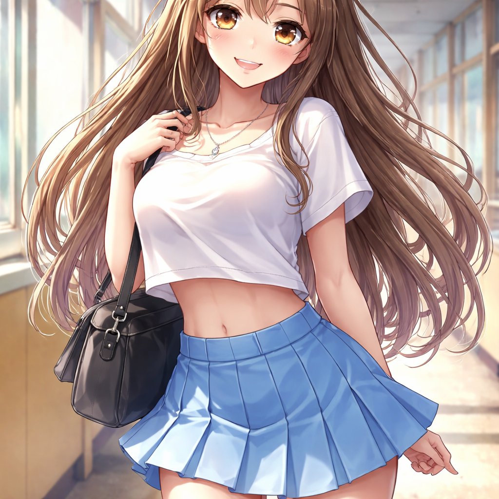 Hot Anime girl at the school in a white loose crop top and sky blue mini mini skirt.