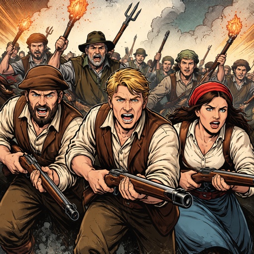 Realistic. Refined. Groups of peasants holding rifles. No speech bubbles, no caricature