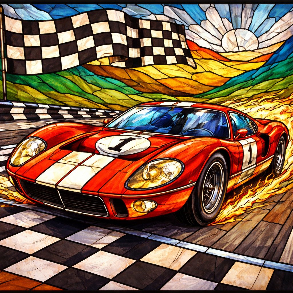 Like a stained glass window a 1960s racing car speeds across the finish line no speech bubbles no caricature