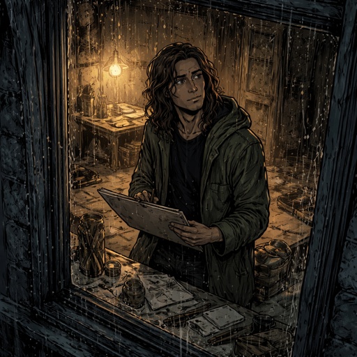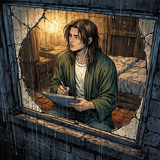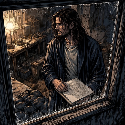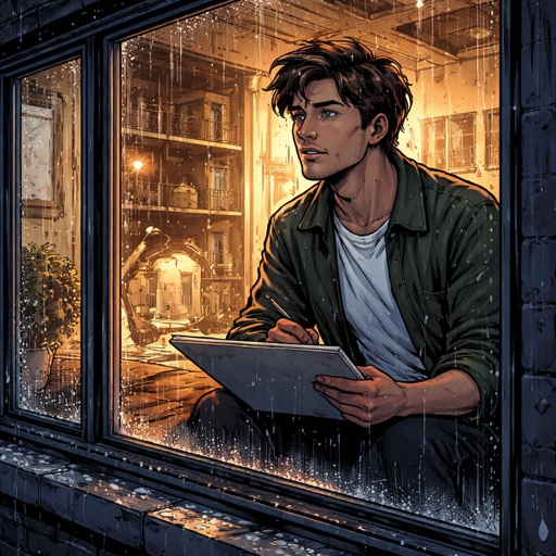Refined realistic, no caricature no speech bubbles a young artist in his 20s is looking out of a window. It is raining a...