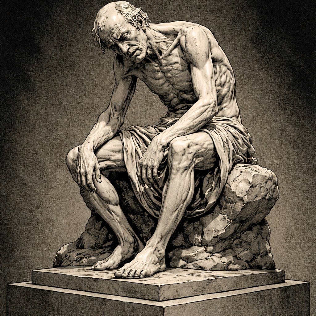 Refined realistic, no speech bubbles, no caricature a sculpture of a very tired, weak old completely naked man. His face...