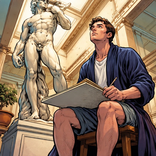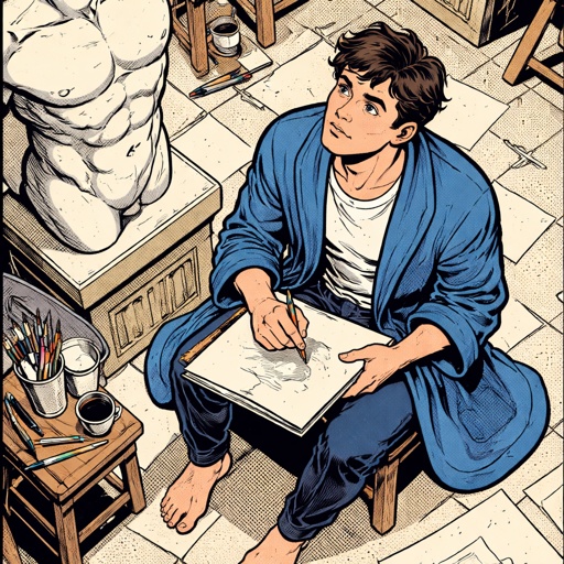 Realistic, refined, no caricature no speed bubbles a young man in his 20s in a robe is sitting with a drawing pad lookin...