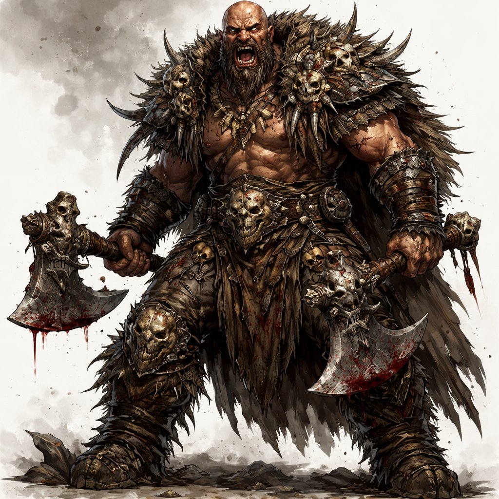 Massive (6’6”), thick, brutal physique • Bald with a thick beard, teeth slightly broken • Armor is mismatched, layered with leather and bone trophies Personality: Savage, relentless, thrives in chaos. Where Garrick is control, Roderic is unleashed violence. Weapons: Twin axes — “Fang” and “Rend” • Known to split shields and men alike