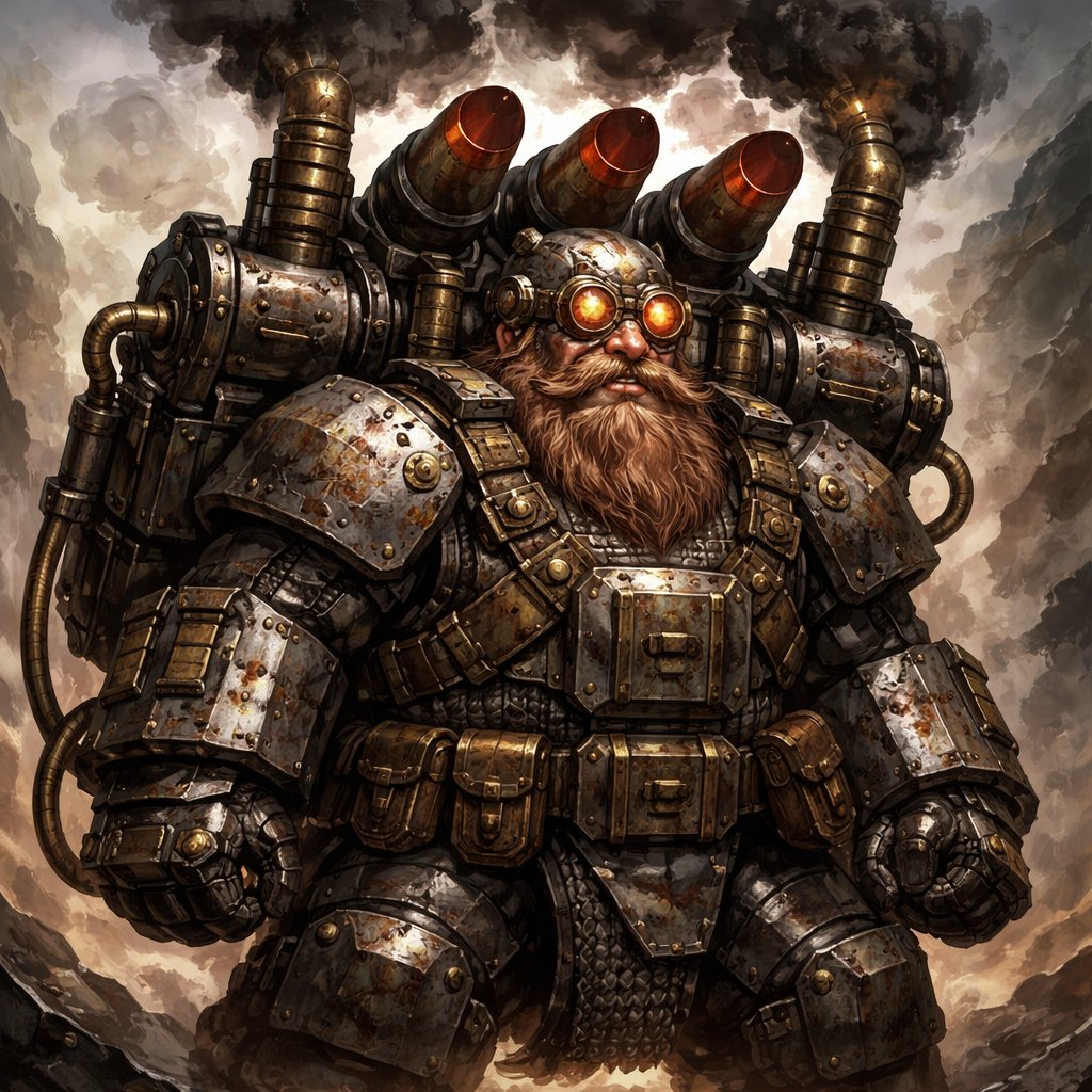 A dwarven warrior wearing an artillery backpack and holding grenades