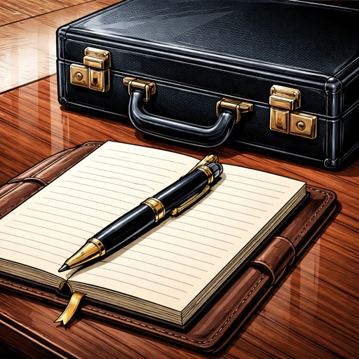 No speech bubbles, an expensive pen and notepad, and attaché case full view of all objects