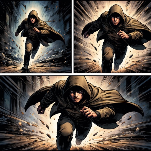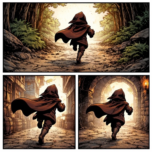 Refined realistic no speech bubbles. A small figure in a cloak is running out of frame toward us. Three views.