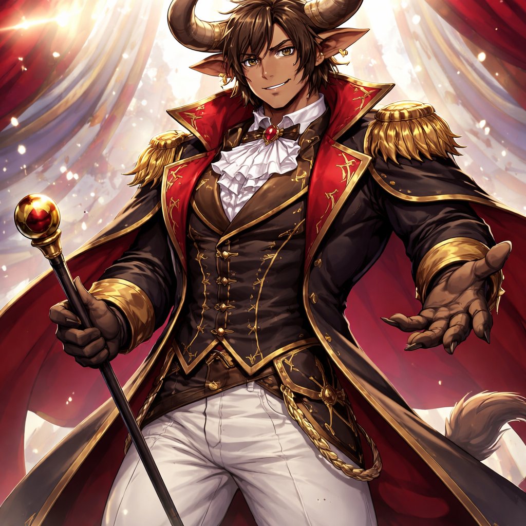 A male medium brown Minotaur with brown eyes that has a well~proportioned figure that works at freak show as the ringmas...