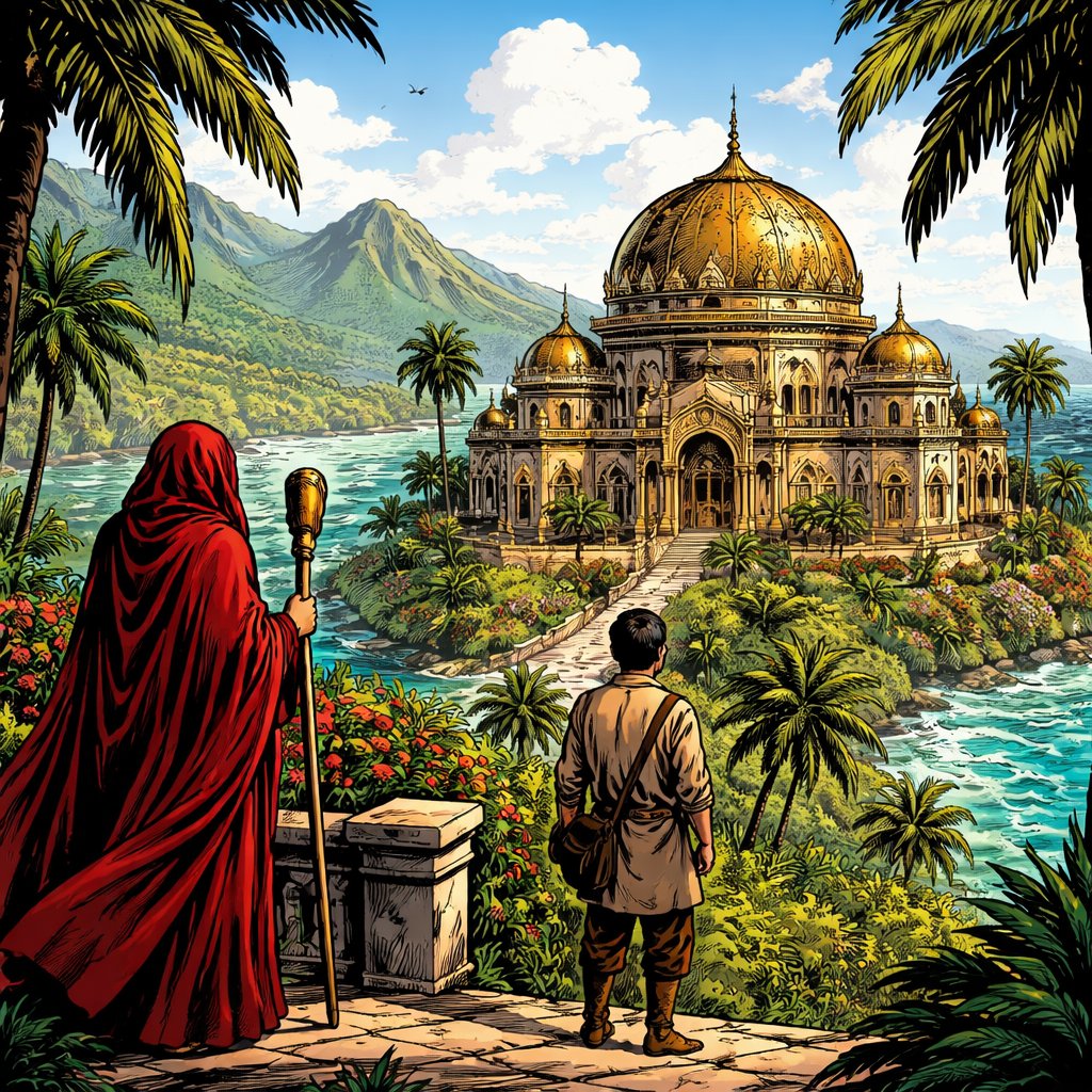 South American setting palm trees, huge villa in background mountains ocean we’re standing beside an ornate magnificent domed building. There is a old person in a red robe completely covered. We don’t see his face and young man in a more peasant robe standing looking at the dome.