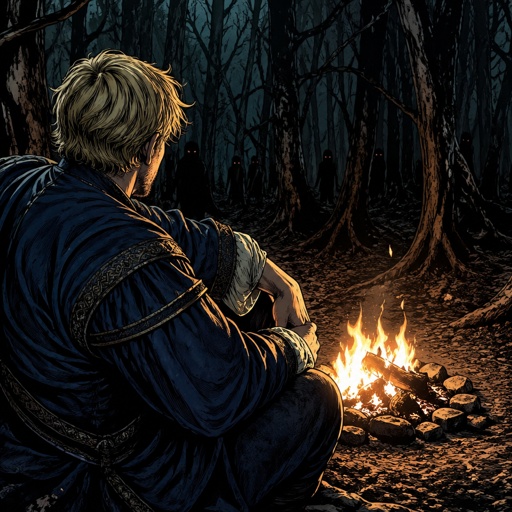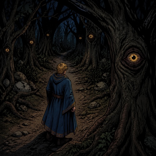 Tealistic, refined, no caricature. Full body. a man in a black hooded robe stands on the side of the road. We see him in...