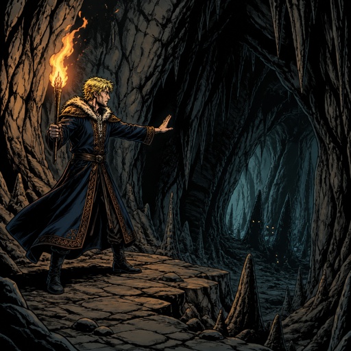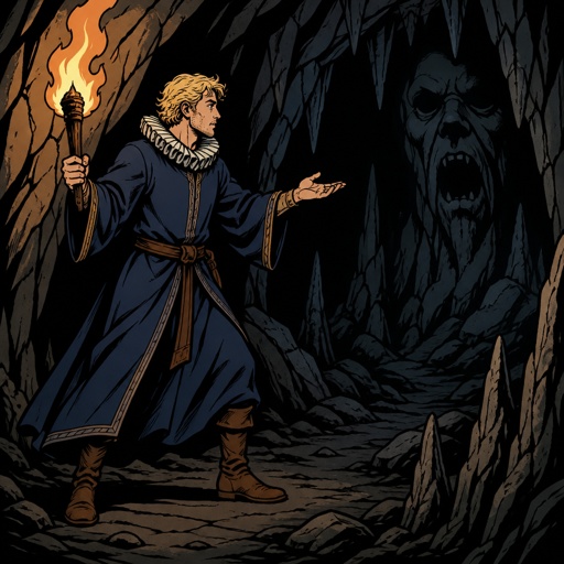 Very dramatic, a dark cave, mysterious, and scary Realistic, no speech bubble, no caricature. Side view. Full body and f...