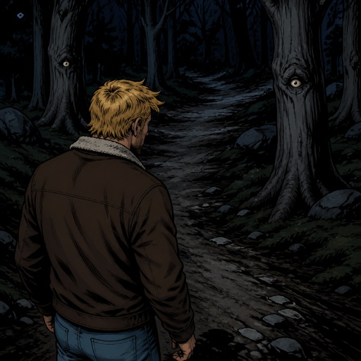 No caricature, no speech bubbles realistic drone over the shoulder shot blonde young man with stubble on his face and to...