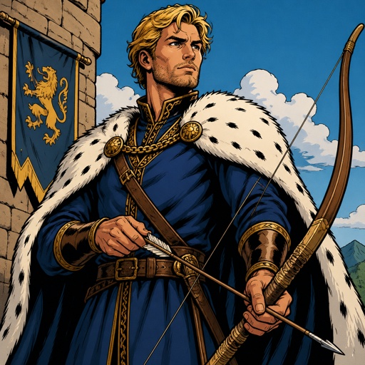 Full head full body . Realistic, no caricature no speech bubble on the right side a young man blonde with household hair, and Renaissance robe is aiming a bow and arrow