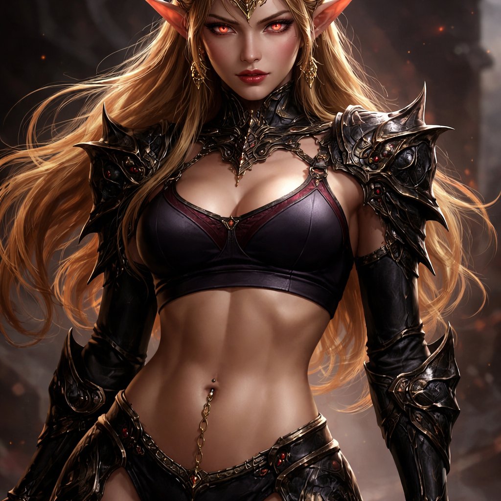 Evil princess Zelda in a sports bra with a navel piercing chain and black armour on her legs and shoulders