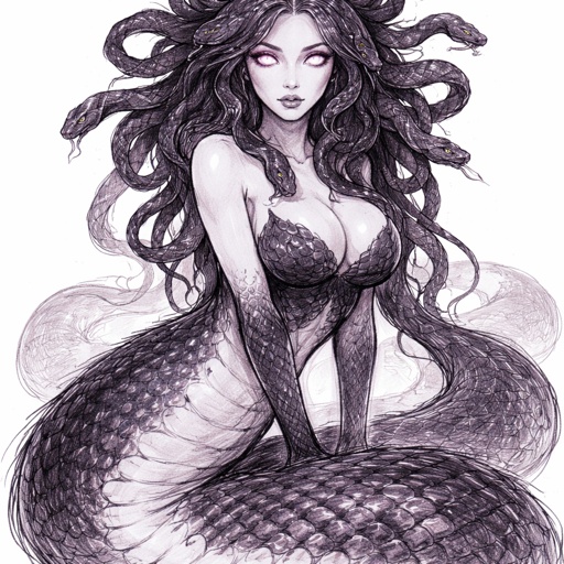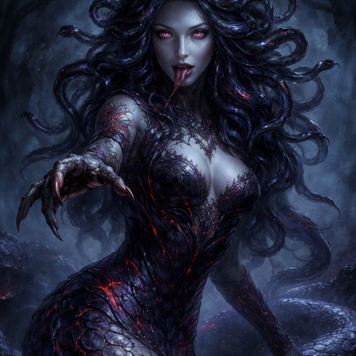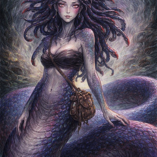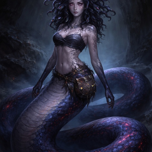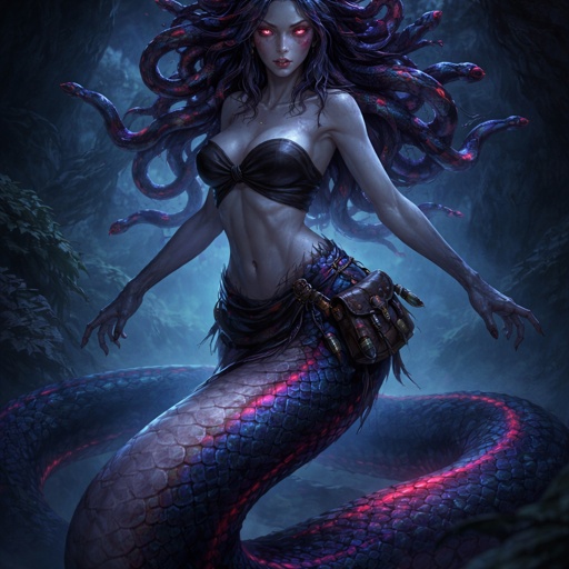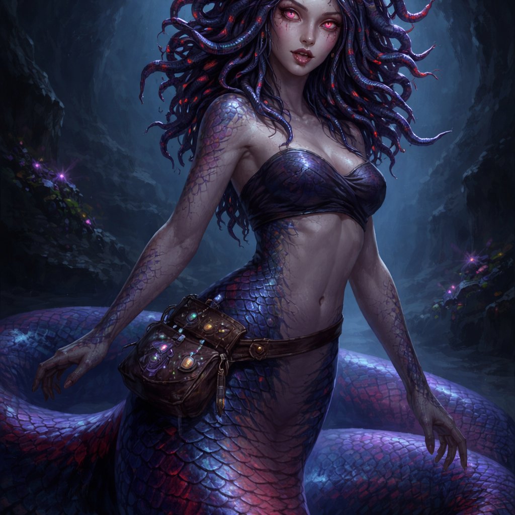 A fantasy gorgon woman in quiet motion. She has a long, thick, elegant serpent body with smooth scales in dark blue and purple gradients, accented with bright red. Her scales softly glow with bioluminescence in low light. The transition from snake body to human torso is seamless, with natural scale patches blending into skin. Her upper body is toned but slender.  She has a delicate face with a sharp jawline, large round siren-like eyes with vertical slit pupils, hazy pale pink in colour, giving the impression of poor eyesight. Her mouth is subtly snake-like, with a forked tongue just visible. Her expression is calm, wary, and softly feral.  Her shoulder-length hair is slightly curled and mixed with many small serpents woven through it. The snakes are watchful and whispering rather than aggressive, sharing the same dark blue, purple, and red colour palette.  She wears minimal clothing: a simple chest wrap and a small fantasy satchel at her waist filled with shiny trinkets. Her hands show faint, ancient stone-like cracks hinting at petrification powers. The mood is quiet, graceful movement, mythic and atmospheric, with a dark fantasy aesthetic.