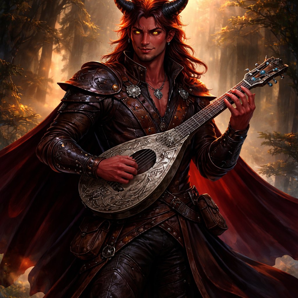 Male in mid 20’s Tiefling bard from the college of dance. Light blue skin, orange eyes, curly brown hair. Fancy silver s...