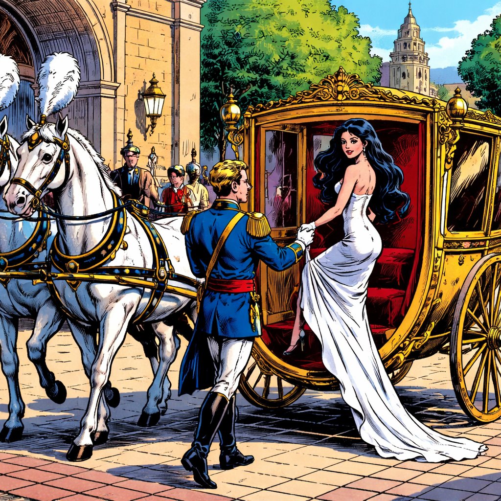 An elegant carriage drawn by two horses with plums an escort escorts a lady into the carriage. She’s very slim to see her from the rear with long black hair. The scene is the inner court of a palace.