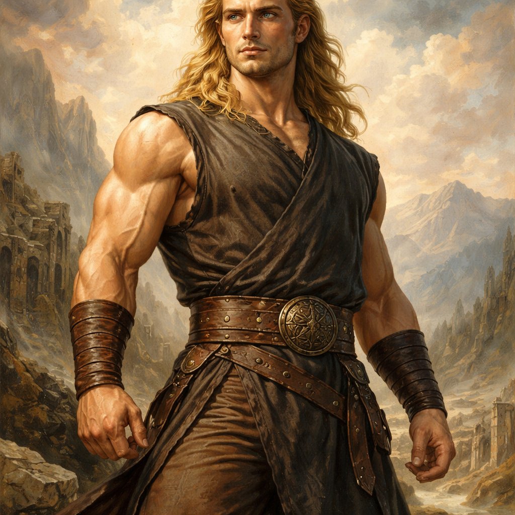A tall well~proportioned figure/body with “broad-shoulders, thick neck, giving an impression of sheer power”. He has “mu...