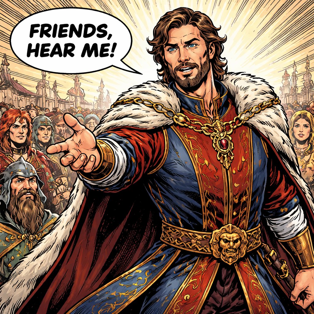 Realistic, refined, a nobleman stands in a crowd of multi costume people. Nothing extreme he is speaking.