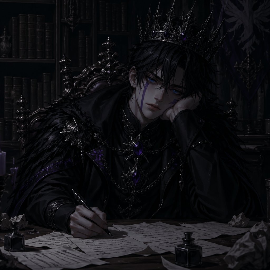 An 18 year old prince who has black hair with purple stripes and blue eyes. He is wearing all black and a black cape. He is wearing a big crown on his head. He is sitting at a desk. Behind him is a big shelf of books of all different sizes. There are blank sheets of paper that cover his desk. He is holding an ink pen in his left hand. He looks bored and tried. The room is dark and has little light.
