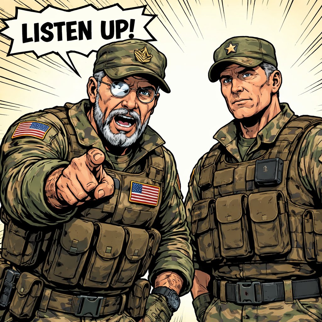 two military manner standing close together one is giving the other lecture. They are both middle aged.