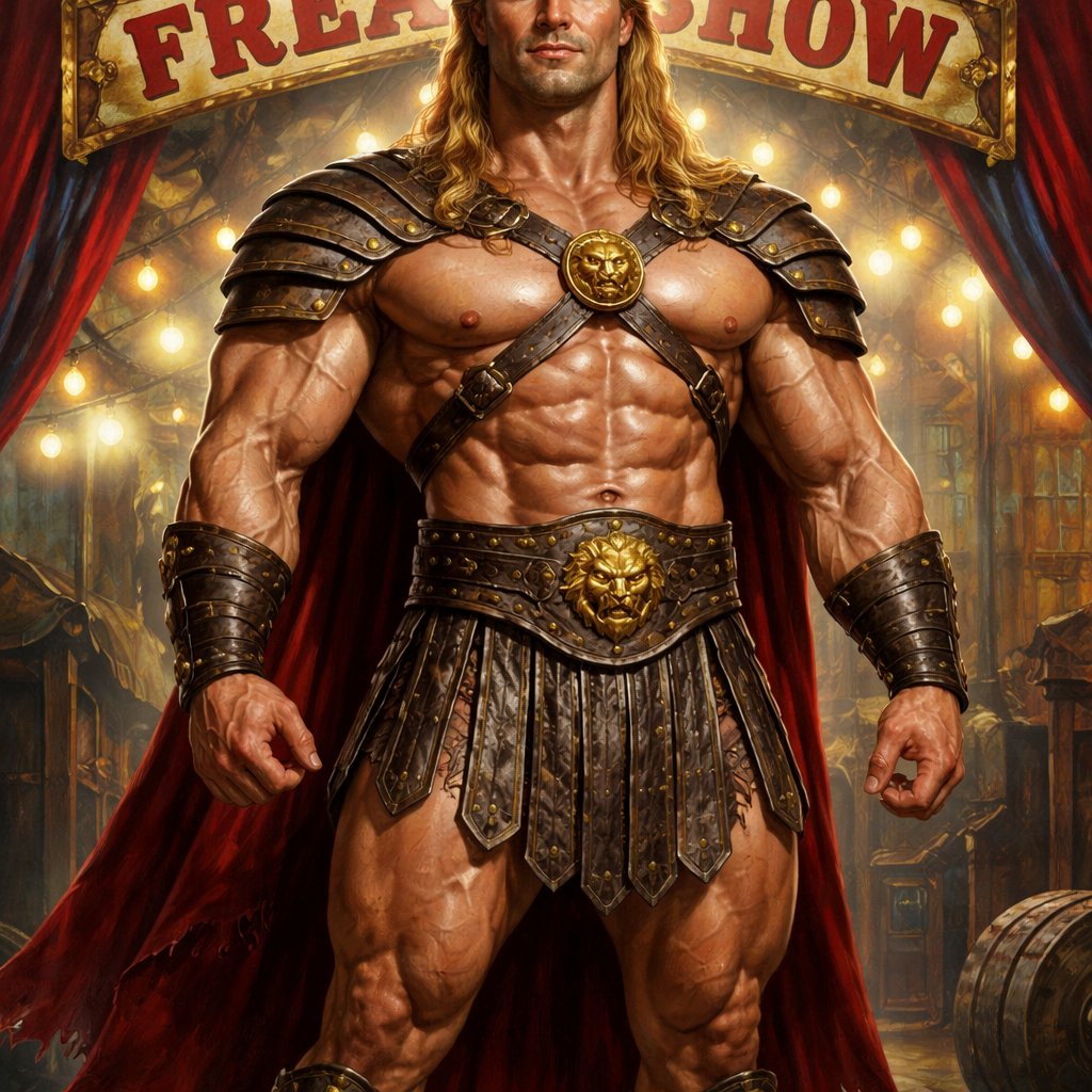 A tall well~proportioned figure/body with “broad-shoulders, thick neck, giving an impression of sheer power”. He has “rippling muscles on his, arms, chest, and legs”. His haircut is a blonde mullet. His “expression is often serene or determined, with deep-set blue eyes and strong brows, hinting at inner depth". He works at freak show as a strong man. His outfit consists of a gladiator outfit.