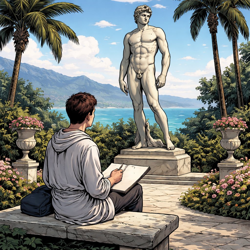 Refined realistic, no caricature no speech bubbles a young man it is early 20s is sitting with a drawing pad on a bench in the sculpture garden looking at a large male, naked sculpture, the garden overlooks mountains, palm trees, and the ocean he is dressed in a simple robe and is facing the sculpture
