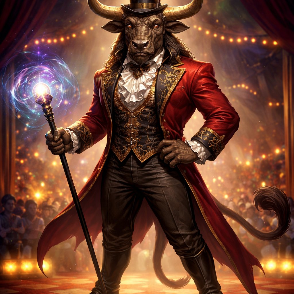 A male Minotaur that’s 6 1/2 feet tall. He has a human-Cretan bull face with deep set bovine like brown eyes. On his Head were large powerful gleaming curved horns like his fathers. He has a well~proportioned figure/body and a long tail, with his skin/fur a captivating Taupe color. He works at freak show as the ringmaster. His outfit consists of a crimson tailcoat, frilly shirt, stunning blazer, pants and top hat. His abilities are Reality Rejection, Time Manipulation (Chronokineses), Zoolingualism (Language of Cattle only), Human Speech.