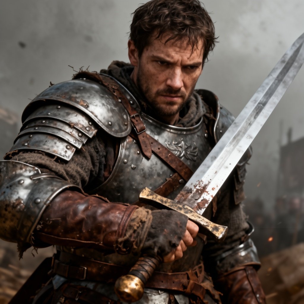 Human warrior holding a huge magical sword point down in front of him. He is covered in spiked armor