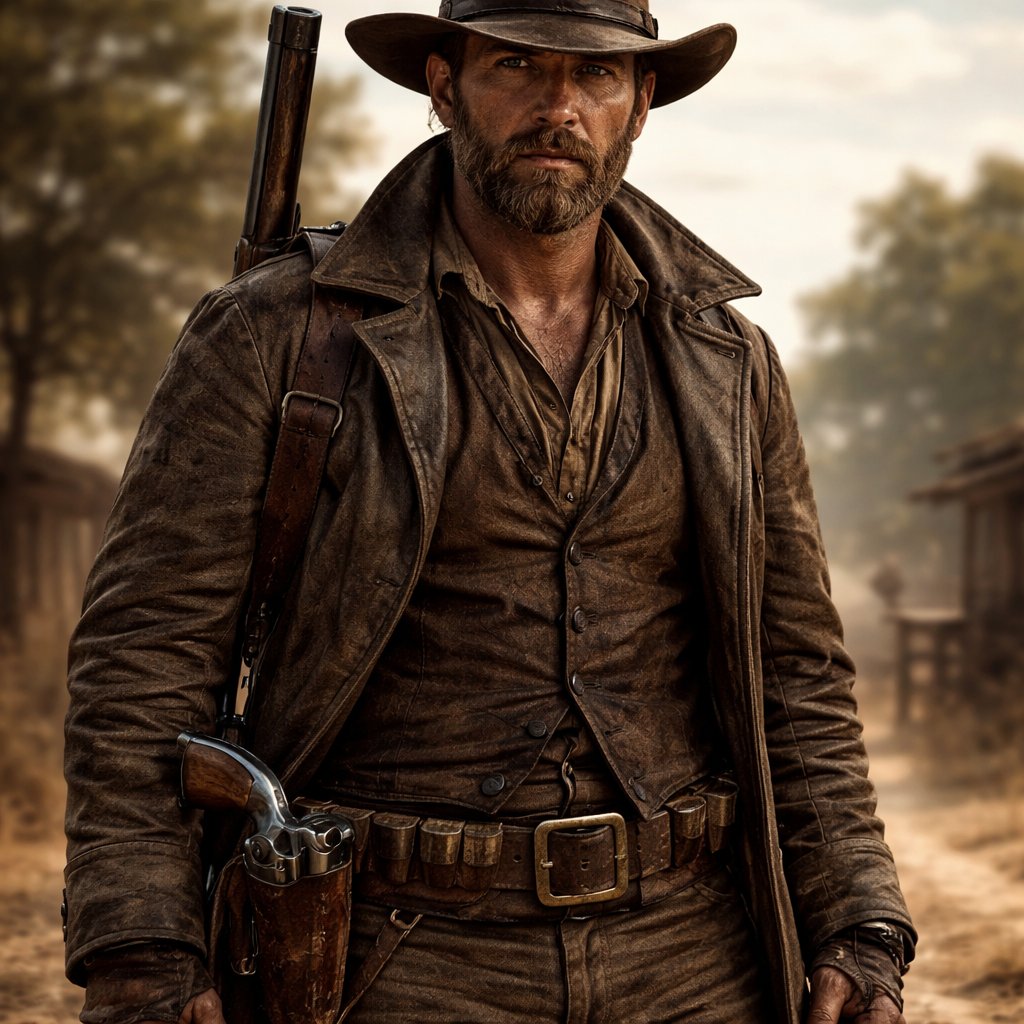 Cowboy bounty hunter from 1882 with a short bushy beard, a rifle strapped to his back, a revolver in its holster, wearing a leather hat, a leather jacket, a belt and brown cargo pants