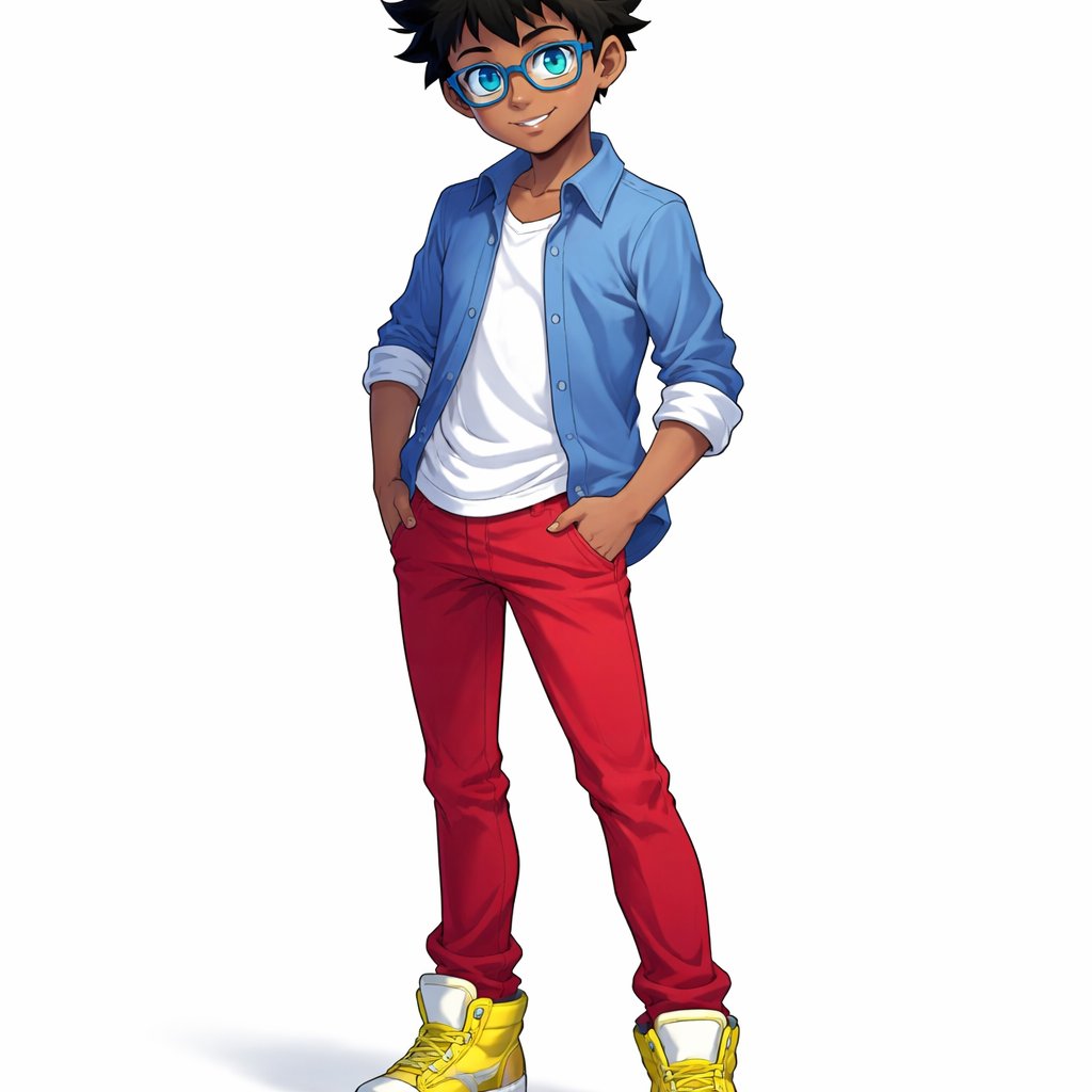 A light skinned black teen boy wearing blue framed glasses, has red pants, blue buttoned up shirt, and yellow shoes.