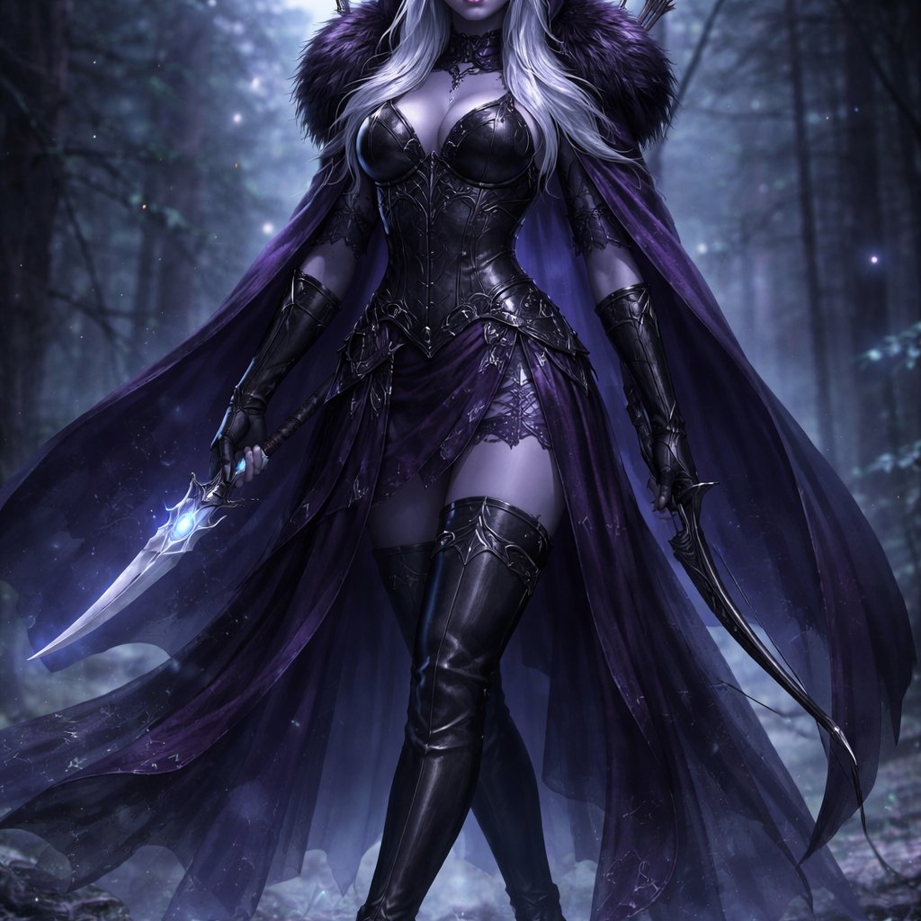 She is a high moon Elf fighter with a blue/grey skin tone She has hair white as snow she has light purple eyes she’s wearing a deep purple hooded cloak with black fur around the hood she’s not wearing the hood and she’s wearing a black corset style bodice it’s form fitting sculpting the waist and torso made of matte black leather or faux leather with visible vertical seams and subtle boning that give it a cinched armored look the front features, decorative straps and buckles, adding a utilitarian almost battle ready detail the neck line is a deep sweetheart cut, enhancing the chest, while still feeling intentional and dramatic rather than casual above the bodice is a high choker like collar that connects to the top framing the neck and giving a regal commanding presence. There are shoulder, cut outs, exposing skin, while keeping the overall silhouette sharp and controlled. The sleeves are long fitted at the arms then dramatically flared at the wrists. The fabric appears to be a mix of soft leather and flowing chiffon with the flared cups made of sheer material that drapes elegantly the skirt is asymmetrical and layered combining opaque and sheer elements. The outer layer is a long flowing sheer over skirt that reaches the ankles almost like a veil underneath is a short fitted mini skirt or structured under layer, keeping the look bold and revealing. She’s also wearing leather garter straps wrapping around the thighs. These straps connect the bodies/skirt to the stockings. The legs are covered by thigh, high boots or stockings with a glossy black finish. The boots are sleek and fitted possibly lace up or paneled finished with sharp pointed high heels. Holding a dagger in one hand with a long bow strapped to the back and a curved sword in her other hand.