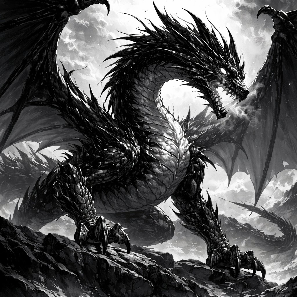 A large dragon that is both black and white with simple yet many details.