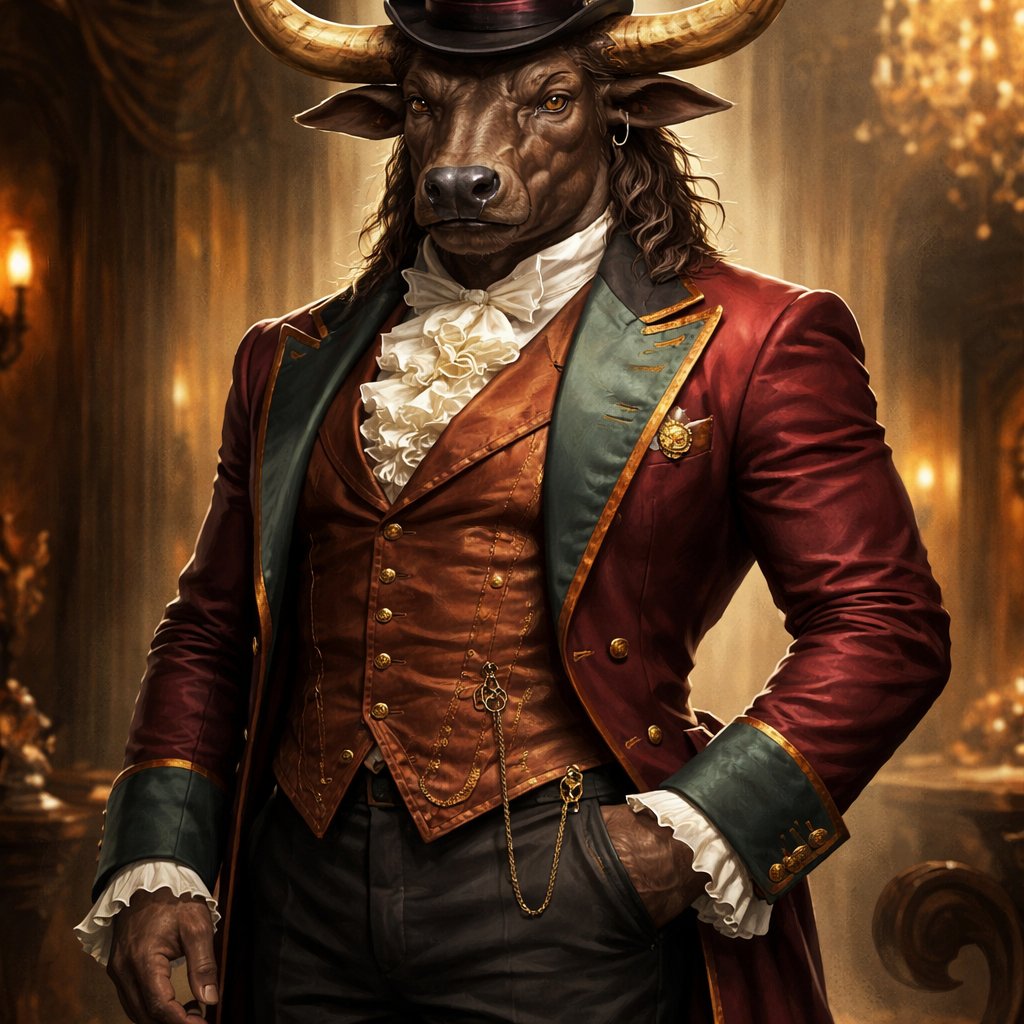 A male Minotaur that’s 6 1/2 feet tall. He has a humanoid-Cretan bull smooched face with deep set bovine brown eyes. On his head are large powerful gleaming horns like his fathers. He’s got a well~proportioned figure/body and a bovine tail, with his skin and fur being a captivating Taupe color. He works at freak show as the ringmaster. His outfit consists of a crimson and teal tailcoat, frilly shirt, stunning copper blazer, black pants and top hat. His abilities are Reality Rejection, Time Manipulation (Chronokineses), Zoolingualism (Language of Cattle only), Human Speech.