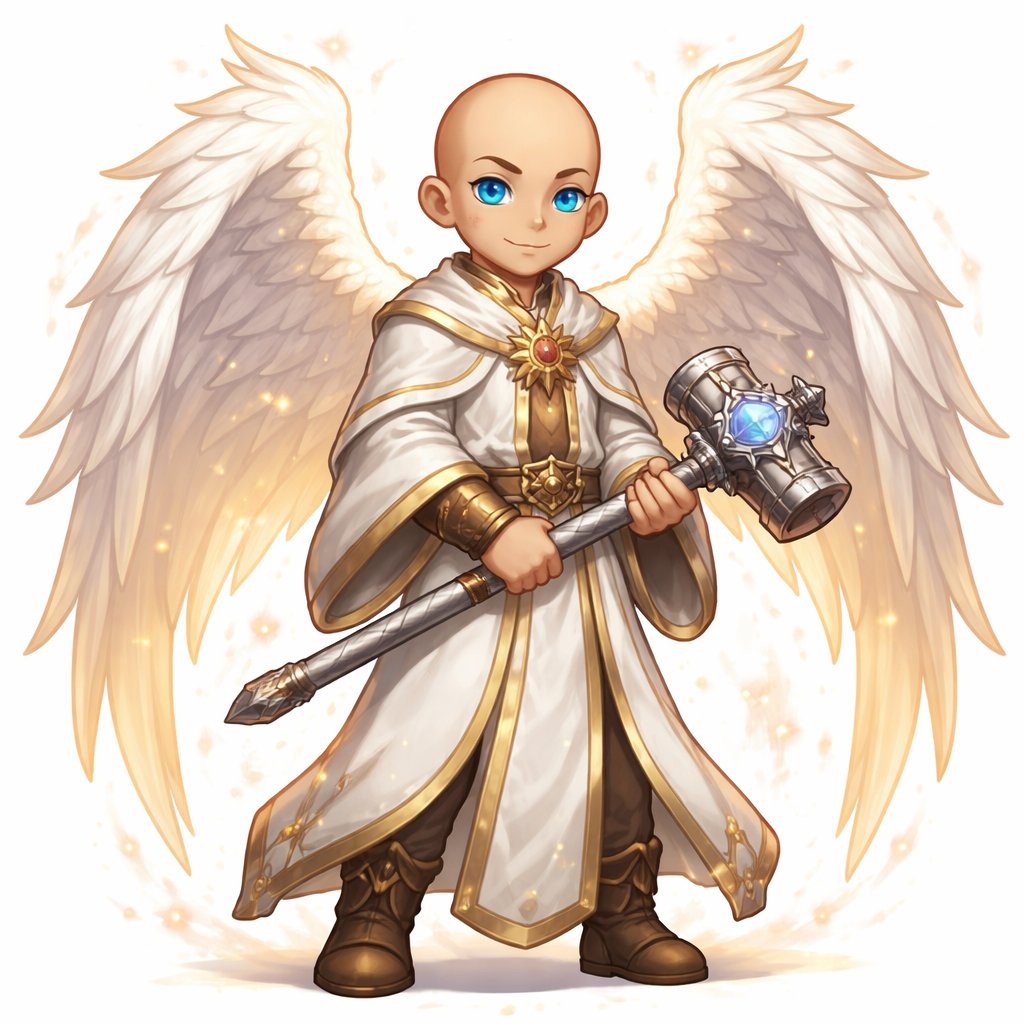 Heavenly Aasimar sprite, bald, blue eyes, war cleric