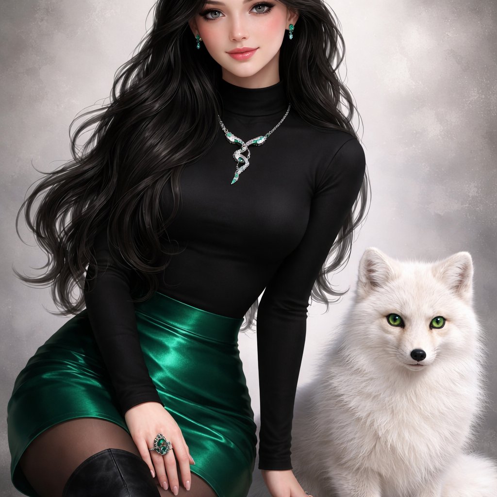 You can see the top of her head. Sitting in a train compartment. A teenager girl sitting with long black hair and grey eyes. Her hair is set in soft waves resting just above her but. Her eyes are storm grey. She is wearing a black long sleeve turtleneck and a satin Green skirt that ends mid thigh. black tights and black thigh high boots. She has a small golden necklace of a snake and a silver ring with a b on the top to the left of the b is a black diamond and to the right is an emerald. She has an arctic fox next her with bright green eyes. She has fare skin and a soft smile on her face. she has emerald stud earrings in both ears you can see her full body and she is wearing a small crown at the top of her head it was black with green accents
