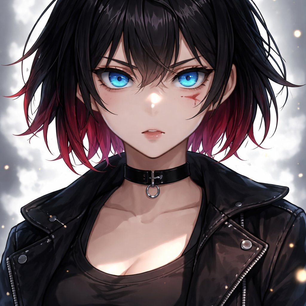 A girl with short black hair and red tint having a scar under left eye having beta blue wolf eyes