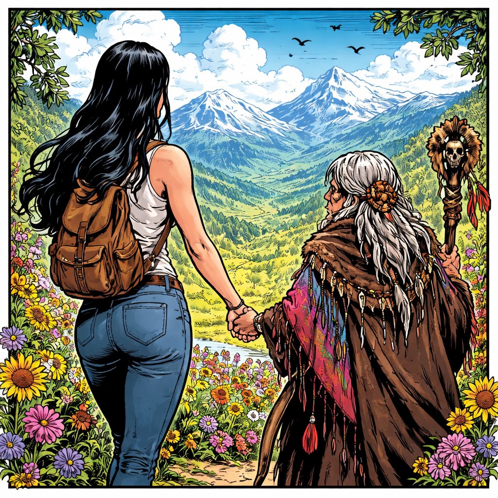 A tall young woman with long black hair rear view is holding the hand of an old female shaman. They are surrounded by colourful flowers and lovely mountains in the distance. bright day