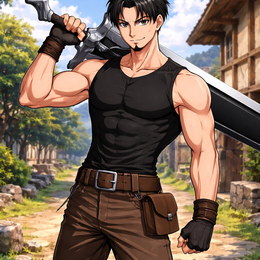 Adolescent with goatee, 6ft, slightly bulky with refined muscles, basic medieval pants with a tight black sleeveless shirt, a silver handle with a black blade that has a simple silver design in the middle, black hair, even hair with a middle part, hair is flatter at the top, sharper and more square like face