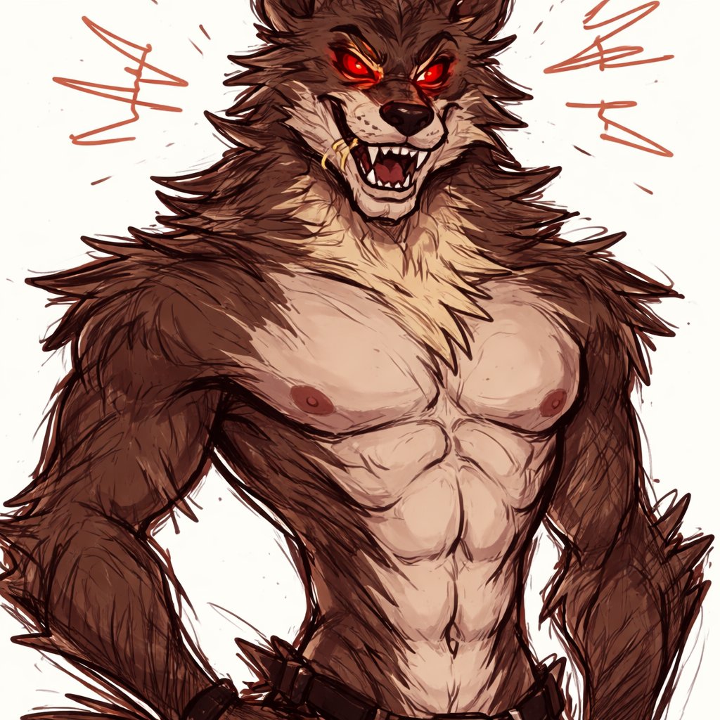 Hazbin hotel styled art : a bear wolf that is shirtless and has alastors body build and isn’t very furry