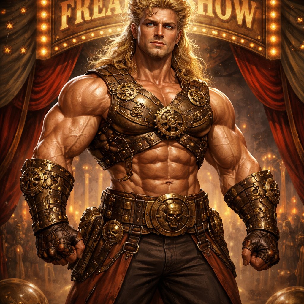 A tall well~proportioned figure with “broad-shoulders, thick neck, giving an impression of sheer power”. He has “rippling muscles on his, arms, chest, and legs”. His haircut is a blonde mullet. His “expression is often serene or determined, with deep-set blue eyes and strong brows, hinting at inner depth".  He works at freak show as a strong man. His outfit consistsed of a gladiator outfit but with semi fitted brown pants.
