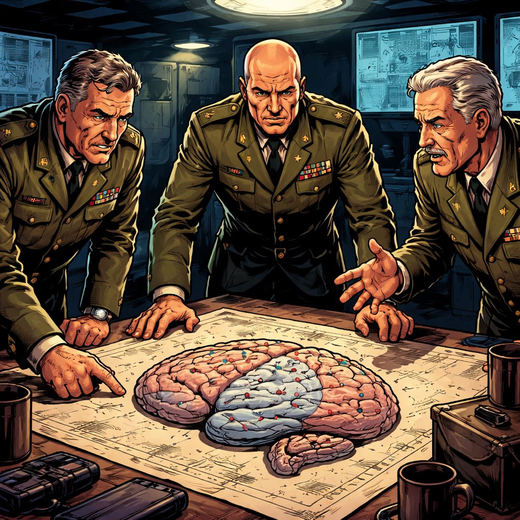 Three middle-aged military men are standing around a table in intense discussion. On the table is a map of the human brain. It is some kind of command room.